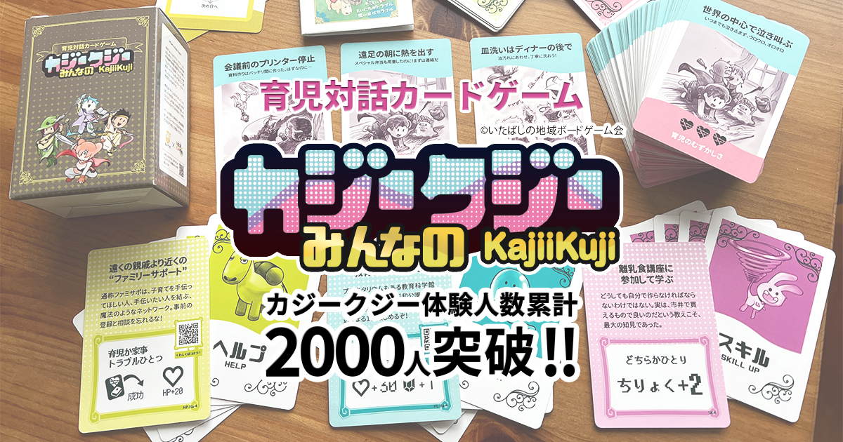 育児対話型カードゲーム「みんなのカジークジー」は、プレイヤー2人が勇者、賢者、舞踏家、詩人になり、次々と襲いかかる家事・育児・仕事のトラブルを解決していく対話型の協力ゲームです。
